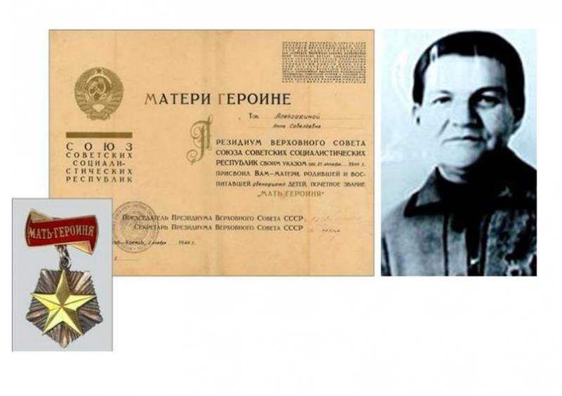 Nell'Ottobre 1944, epoca della grande guerra patriottica, fu introdotta su ordine di Stalin, il titolo "Madre Eroina". La legge stabiliva che una donna, cittadina sovietica, avendo almeno 10 figli aveva il diritto ad ottenere il riconoscimento sopraindicato. Il primo Novembre 1944 fu Anna Aleksahina, all'epoca 58 anni, ad ottenere la medaglia di "Madre Eroina" come prima donna nella storia del Paese. Anna fu ricevuta al Cremlino, essendo madre di dodici figli (dieci maschi, due femmine ), venne chiamata la Madre N. 1 dell'URSS (come da foto). In seguito, 431.000 donne sovietiche ottennero il titolo. Nel Novembre 1991, un mese prima del collasso definitivo dell'URSS, il riconoscimento fu cancellato, abolito. Dopo trent'anni ritorna il titolo "Madre Eroina", per una donna, cittadina della Federazione russa, che abbia almeno 10 figli. Il premio è di 1.000.000 di rubli, circa 16.100 euro.