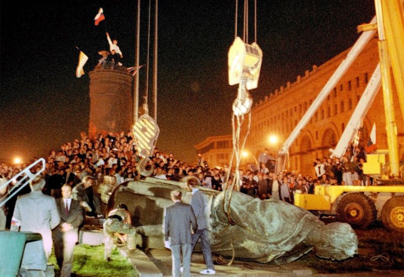 Il 22 Agosto 1991 fu un giorno assolutamente incredibile nella storia dell'ex URSS. Il golpe militare iniziato il 19 Agosto 1991 per mettere fine alla Perestrojka e fermare il processo di indipendenza delle repubbliche, restaurando così la dittatura del partito unico, fallì. In giornata fu data la notizia che gli otto organizzatori del golpe, capeggiati dal presidente del KGB, Vladimir Krjuckov furono arrestati. La gente si riunì a Mosca sotto la statua di Felix Dzerzinskij, fondatore della prima polizia segreta sovietica in Piazza Lubyanka, per demolire la statua simbolo per eccellenza della dittatura. La gente non aveva più paura, sventolavano le bandiere non più dell'URSS ma della Russia e dell'Ucraina (il Paese avrebbe dichiarato la sua indipendenza dopo due giorni, il 24 Agosto 1991). Fu una festa immensa, indescrivibile gioia, momenti di liberazione. Lo stesso giorno Gorbaciov ritornò a Mosca dalla Crimea dove fu isolato dai golpisti ed iniziò così l'epoca del... final countdown.. Rimanevano ancora quattro mesi poi fu sepolto, la sua storia finì con un fallimento impressionante. L'URSS vinse la seconda guerra mondiale ma fu sconfitta in tempi di pace. La foto che condivido illustra tutto, senza dover aggiungere nulla.